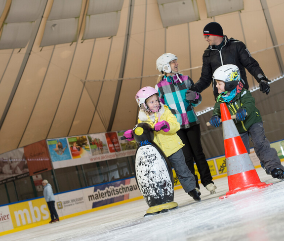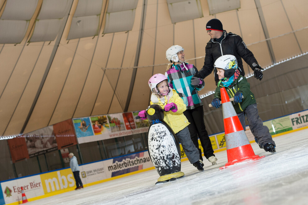 Von Mitte Oktober bis Anfang März verwandelt sich die große Zelthalle im Aktivpark in einen 1.800 m² großen Wintertraum für Eisflitzer und Hockey-Gladiatoren. Dann heißt es aktiv sein auf der sensationellen Kunsteisbahn beim Eislaufen, Eisstockschießen, bei Eishockey-Spielen und beim Tanzen in der Eis-Disco. Schlittschuhverleih direkt vor Ort.