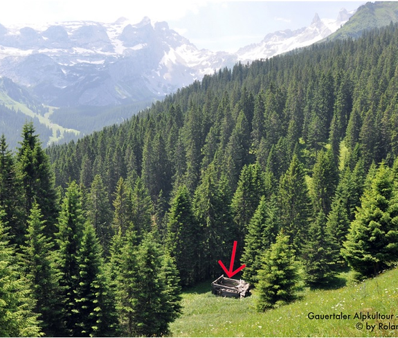 Hier befinden Sie sich auf dem Maisäß Wachters Dieja. Dieses Gebiet - wie viele andere ähnlicher Art im Montafon - wurde vor langer Zeit in mühevoller Rodungsarbeit von Waldbewuchs befreit, um Futterflächen für das Vieh zu gewinnen. Inzwischen holt sich der Wald diese Flächen wieder zurück.