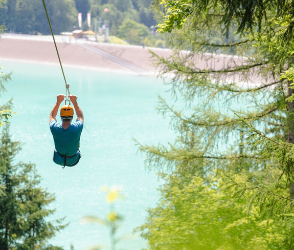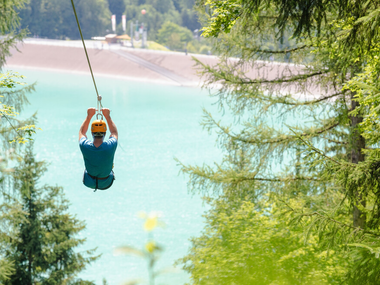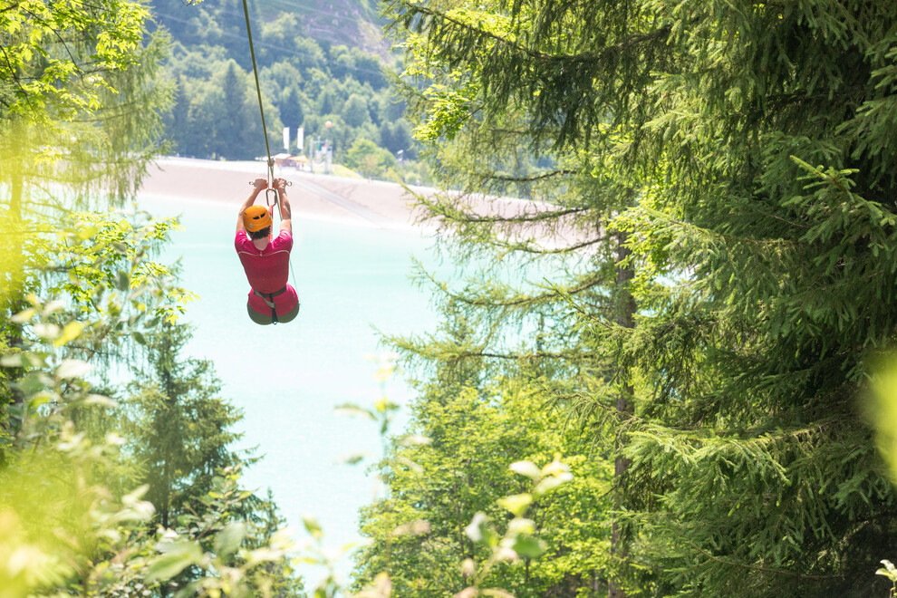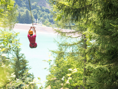 Mit dem Flying-Fox-Golm „fliegst“ Du an einem 565 m langen Stahlseil befestigt über das Staubecken Latschau. Natürlich mit Sitzgurt und Anhängevorrichtung ausgerüstet.