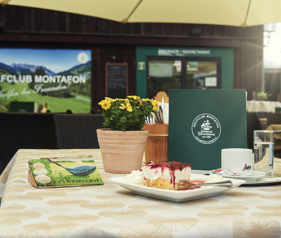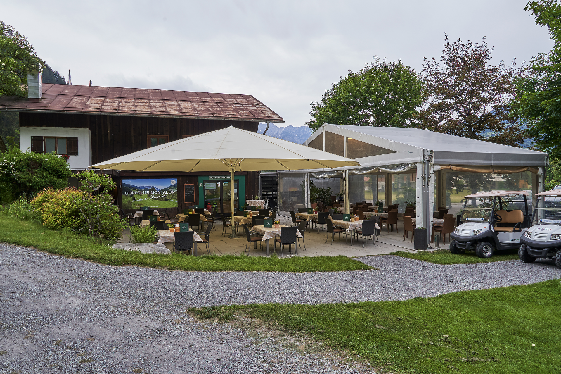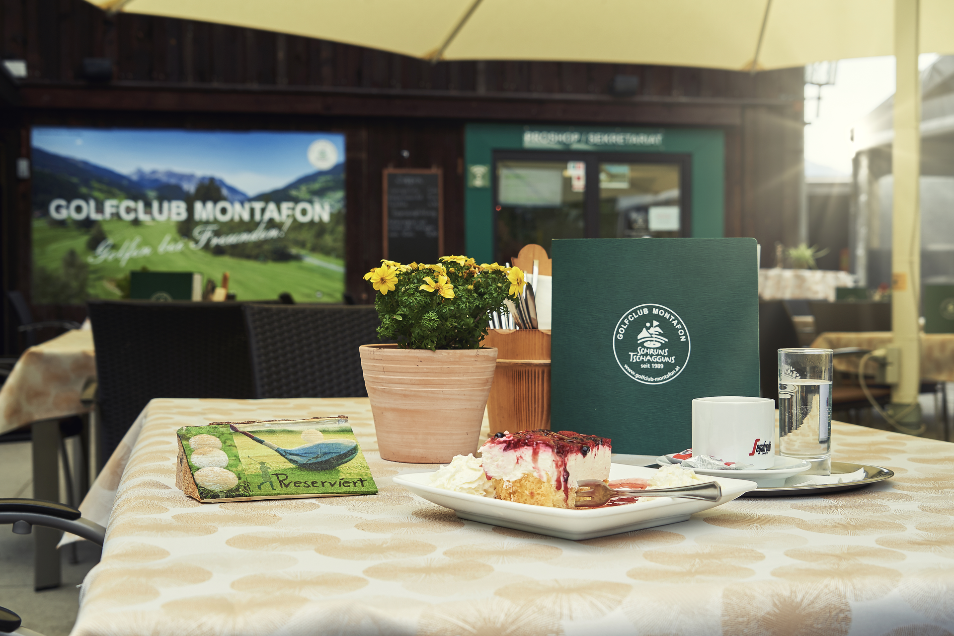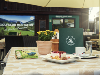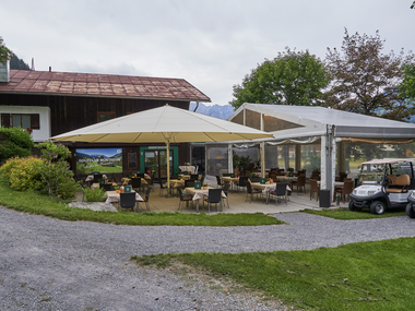 Vor, zwischen und nach einer Runde steht zur Stärkung immer ein Platz bereit auf unserer schönen Sonnenterrasse oder im Panoramazelt beim Clubrestaurant.