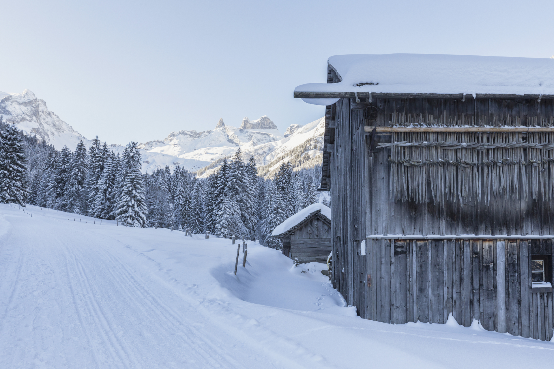 Die Wanderpiste führt im Verlauf eines Forstwegs mit einigen Windungen durch Bergwald und verflacht sich im waldfreien Hochtälchen der Sanüel-Alpe. Bald kommt man dort zu einem Wegweiser, der den kürzesten Weg nach Latschau anzeigt. Für eine Genusswanderung gönnen wir uns aber einen kleinen Umweg, indem wir auf einem fast ebenen Weg noch zehn Minuten bis zur Volsporalpe weitergehen. Dabei betreten wir den schönsten Teil des Gauertals und werden mit dem eindrucksvollen Anblick der Drei Türme belohnt. Und wieder kann man es als einen Hauch von Nostalgie empfinden, wenn man die alten Alp- und Maisäßhütten von Volspora in verschneiter Winterruhe vor sich sieht.