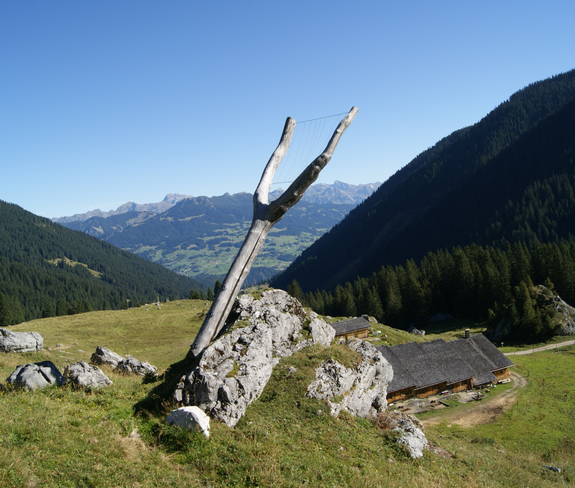 Mit ihren parallel verlaufenden Drähten, die über eine Astgabel gespannt sind, sieht die Käseharfe tatsächlich aus wie ein Instrument. Doch Musik macht sie keine. Sie wird für die Herstellung von Hartkäse gebraucht. Mit ihr wird die eingedickte Milch zerteilt. Je kleiner die Teile, umso härter der Käse. Die überdimensionierte Käseharfe weist auf die Bedeutung der Käseproduktion im Montafon hin. So ist der Sura Kees, der saure Käse, eine regionale Spezialität, die bereits seit dem 13. Jahrhundert produziert wird. Auch auf der Unteren Sporaalpe wird er neben anderen Hartkäsesorten gesennt.
