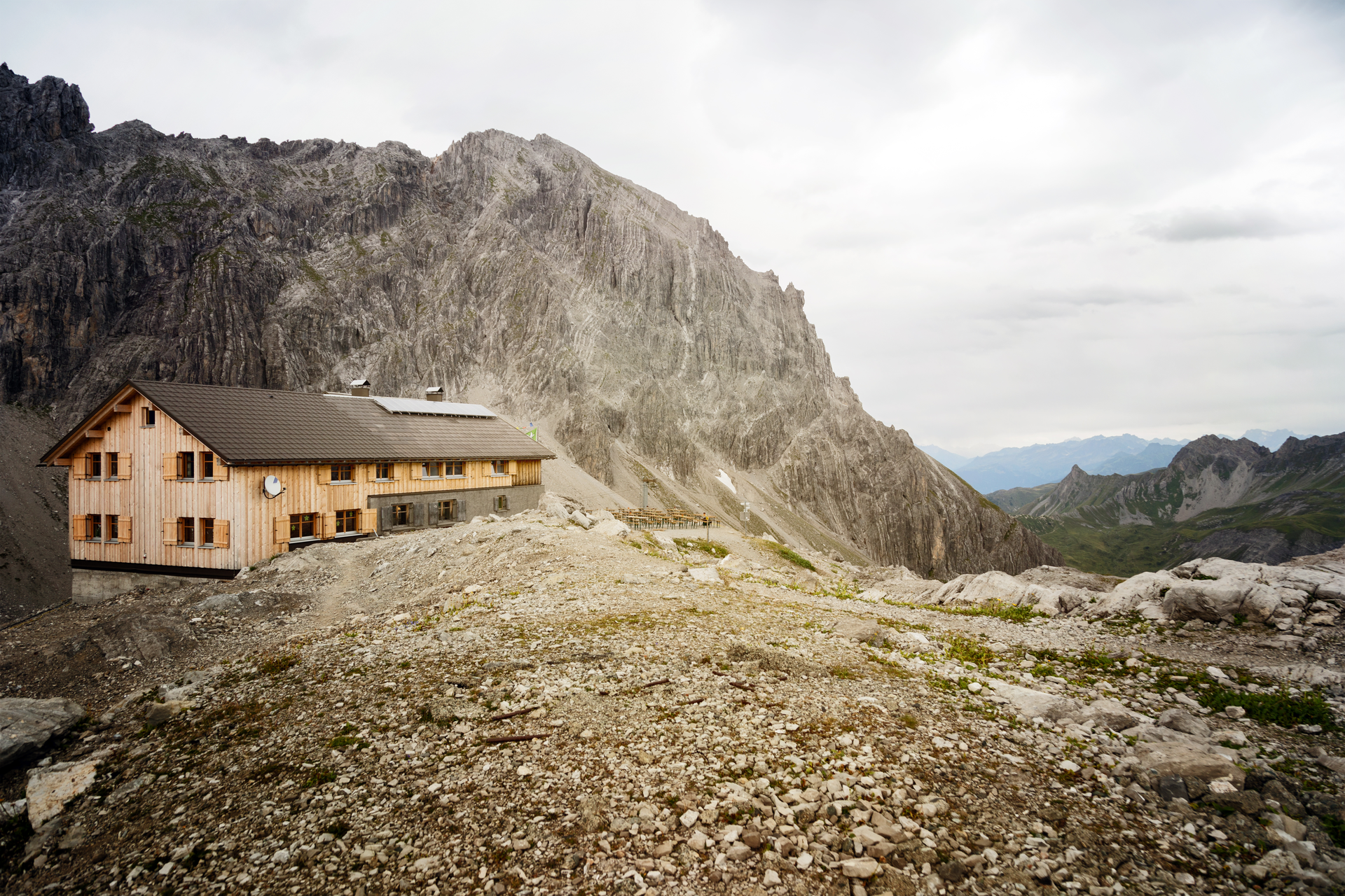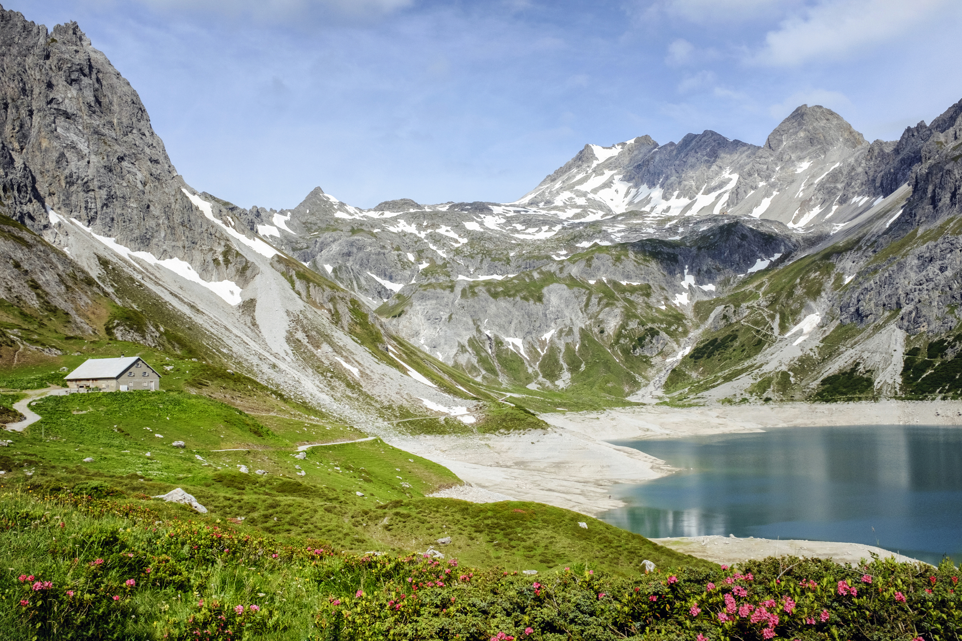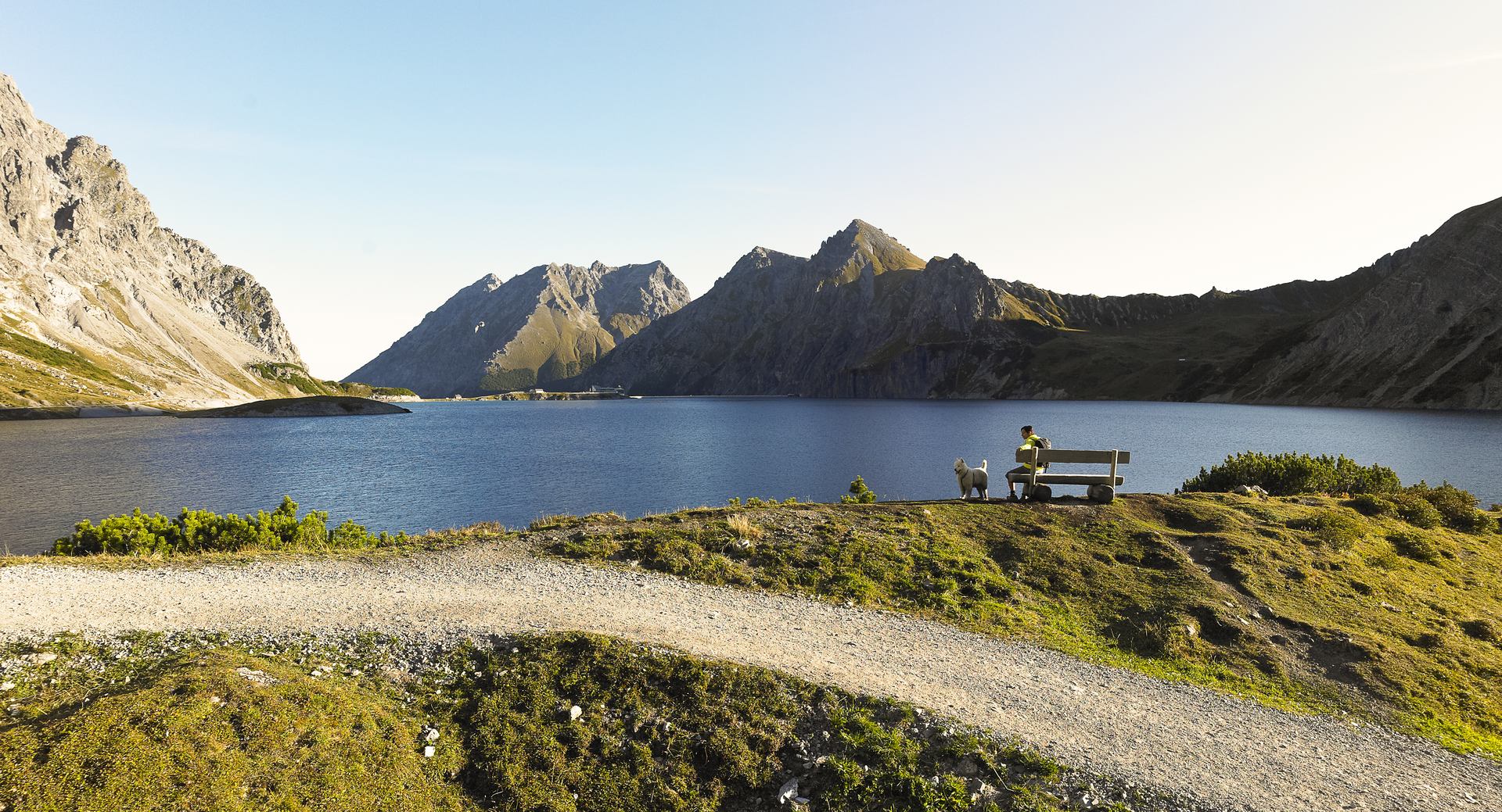 Von der Totalphütte führt ein Pfad ca. 2 km und 300 Höhenmeter bergab zum Lünersee. Wenn Du diese Höhenmeter bewältigt hast, folgst Du ca. 1,2 km dem Uferweg bis zur Douglass Hütte.