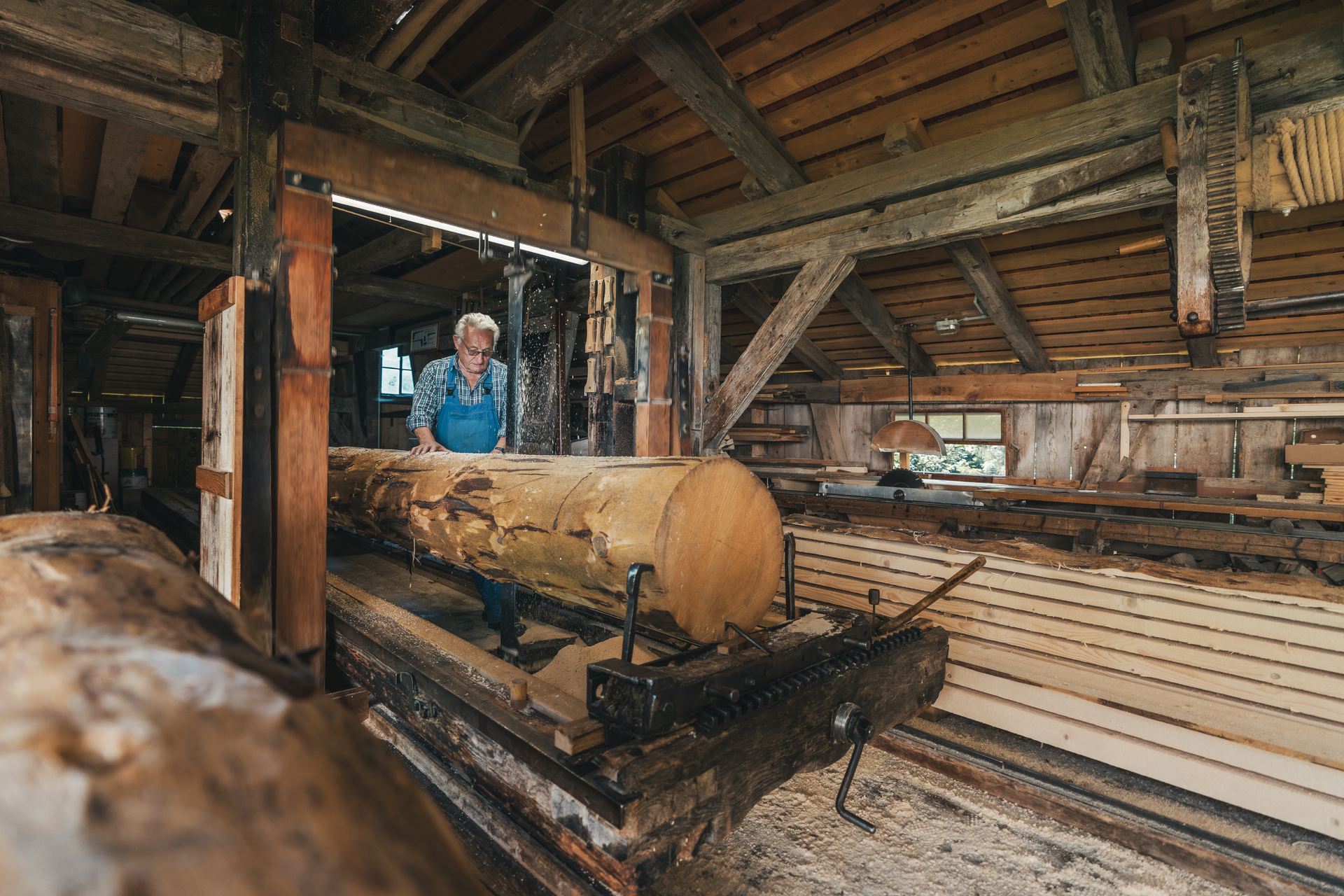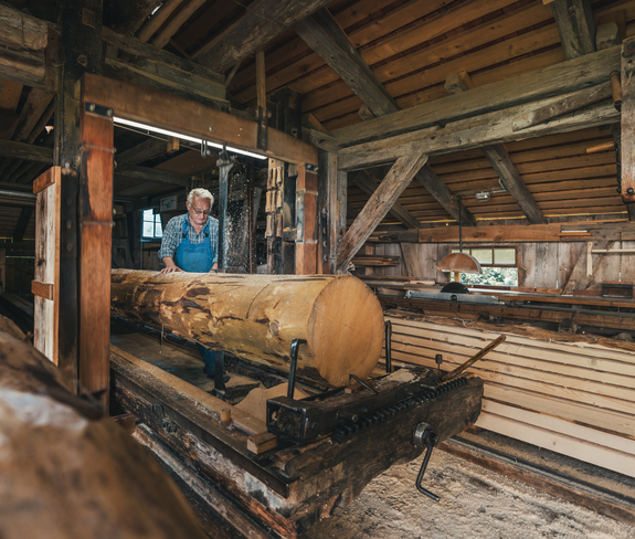Eine Montafoner Institution – das Sägewerk wie der "Mülli-Ferdi", der es betrieb, bis er 97 Jahre alt war. Das Werk von 1734 ist das älteste intakte in Vorarlberg, das mit einem Wasserrad läuft. Heute sägt hier hin und wieder noch Ferdis Sohn Baumstämme. Eine kleine Zeitreise in die Vergangenheit, ihm dabei zu zuschauen. Einst stand neben dem Wohnhaus auch eine Getreidemühle, die vom Rasafeibach angetrieben wurde. Bauern aus der ganzen Region brachten ihr Korn zu Ferdis Vater, weil er es besonders fein mahlte. Daher auch der Name "Mülli" von Müller.